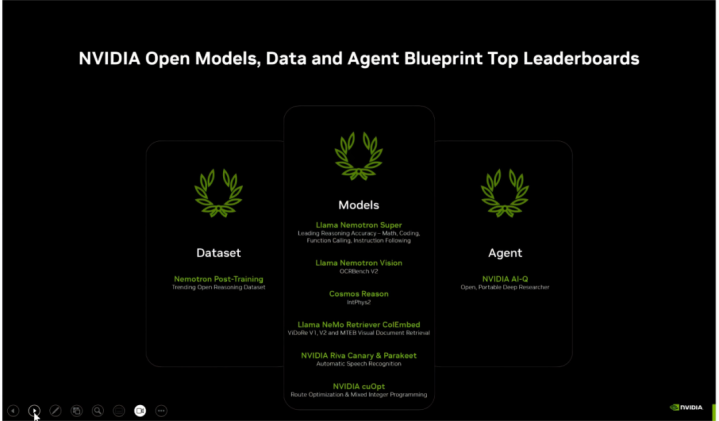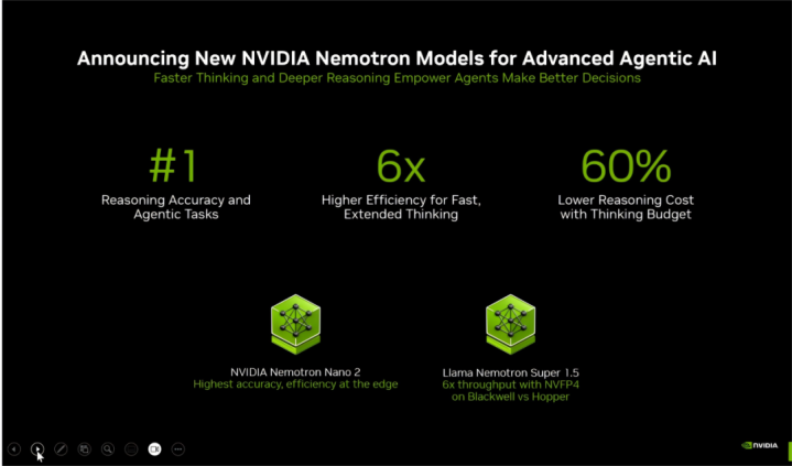 新发布的NVIDIA Nemtron家族模型包括Nemotron Nano 2以及Llama Nemtron Super 1.5。新开源Nemotron模型基于开放透明的数据训练,在同规模模型中针对复杂任务实现了最高精度。其采用全新混合架构和可配置“思考预算”功能,可在AI的深度推理与高效工作之间取得平衡。