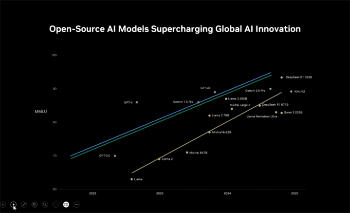 开源AI模型正加速全球AI创新革命,开源模型为社区带来了突破性进展,例如Deep Seek R1、Llama、Nemotron和Queen 3模型的推理能力为AI发展做出了巨大贡献。