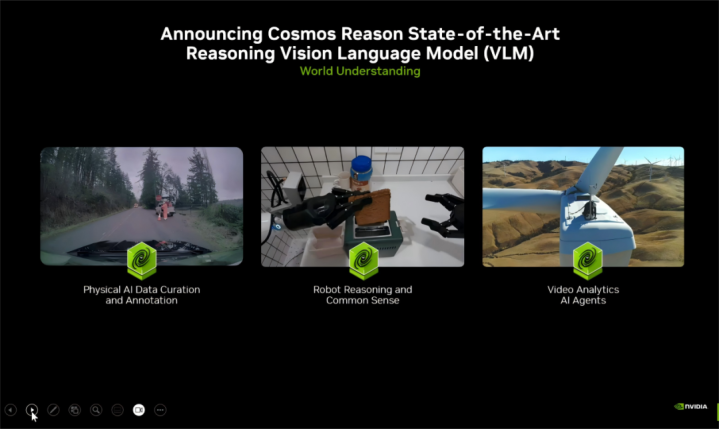 在本次大会上,NVIDIA发布了Cosmos Reason——一款开源、可商用的推理型 VLM,能像人类一样利用先验知识、物理定律理解和物理交互常识进行思考。它能完成非推理型VLM无法实现的任务,如解决多步骤任务、处理歧义或全新未见过的场景。其性能在排行榜中位居前列,且开源可完全定制;70 亿参数规模使其非常适合物理AI边缘和机器人部署——从摄像头到交通灯,所有具备视觉能力的智能物联网设备,所有家庭或工业机器人,现在都能通过Cosmos Reason实现推理。