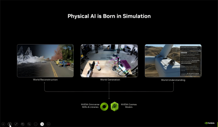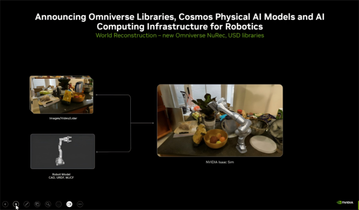 NVIDIA为物理AI构建的每个步骤发布了相应的库和模型。首先是重建世界,这一步骤难度极大,需要大量3D创作者手工建模、应用材质和物理属性,无法手动扩展;而在Carla或Isaac Sim等模拟器中组装虚拟训练场景时,需整合来自真实世界采集、各类CAD工具或其他机器人模拟框架的多类型数据。为此,NVIDIA发布了突破性的神经重建库New Omniverse NuRec,包含用于重建、渲染和增强的库与AI模型,它能将真实世界传感器数据转换为可完全交互的模拟场景,借助Omniverse RTX渲染器添加光线追踪,实现逼真的光照和传感器行为,这对基于感知的机器人至关重要。