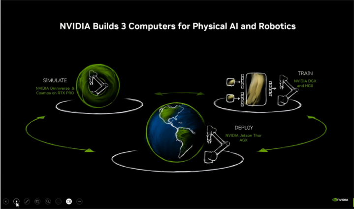 物理AI是能够导航并与物理世界交互的模型,NVIDIA在会上指出其将体现为三类主要的智能机器人:工厂与仓库等设施机器人、运输机器人以及人形机械手与自主移动机器人(AMR)。不同于传统AI语言模型(从文本或图像提示生成文本或视频帧),物理AI基于感官输入和意图来生成下一步动作。对此,NVIDIA也给出了构建物理AI需要的技术架构,涵盖模拟(Simulate)、训练(Train)和部署(Deploy)三大环节,分别对应不同的计算平台,构建起从虚拟场景模拟、模型训练到实际部署应用的完整流程,支撑物理AI和机器人技术研发迭代 。