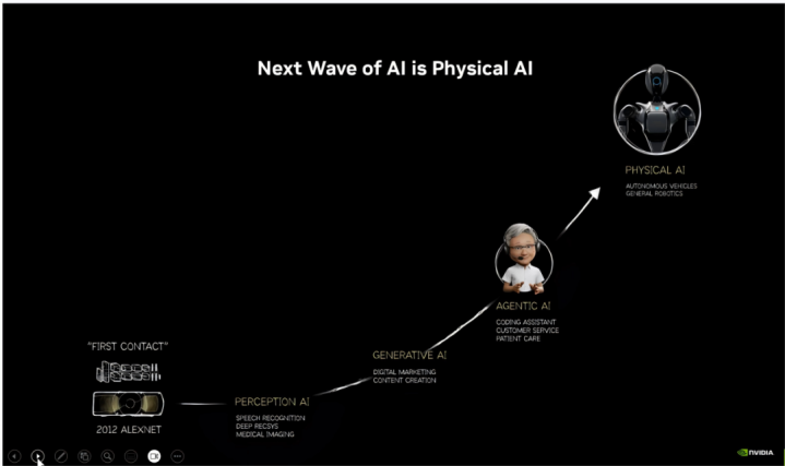 NVIDIA看来,如今AI领域的迅猛发展正推进到代理式人工智能(AGENTIC AI,AI代理),而下一个AI风口——物理AI已近在眼前。