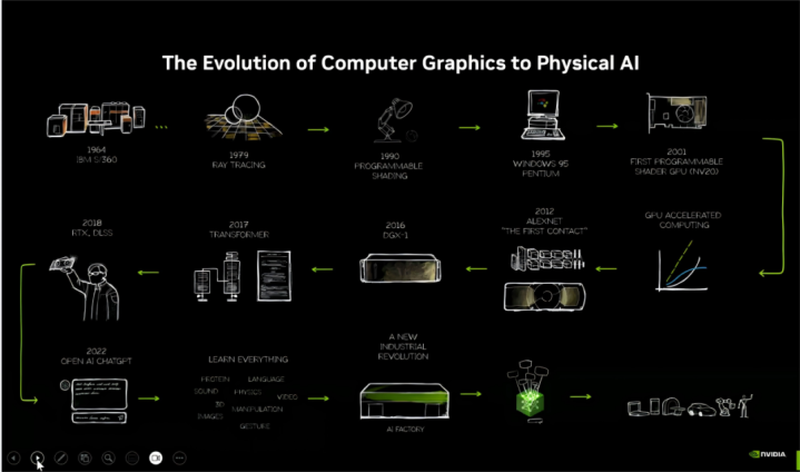 正式发布AI相关新产品与技术之前,NVIDIA在大会上首先展示了计算机图形学到物理AI的演进,通过时间线串联核心技术节点,展现图形学与AI融合的发展脉络。从“图形学技术积累”(渲染、可编程、硬件),到“AI与图形学双向赋能”(AI加速图形,图形数据反哺AI),再到“物理AI的工业级突破”(AI进入现实世界,实现交互与控制)。NVIDIA清晰地表明了技术迭代的核心是“算力、算法、数据”的协同进化,最终推动计算机图形学从“数字创作工具”升级为“物理世界的AI交互引擎”。