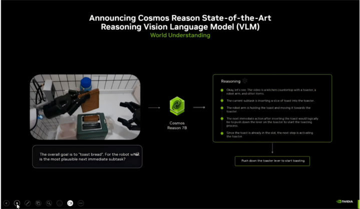 机器人规划与常识:Cosmos Reason作为VLM,能使机器人像人类一样通过指令推理并处理未见过的场景。例如,当对其说出“能帮我做点烤面包片吗”,搭载推理型VLM的机器人会识别烤面包机和面包,将模糊请求转化为具体计划:通过常识判断“一些”指两片或更多面包,选择中等烤度(最常见偏好),并理解用户意图是“享用成品零食”,进而找到盘子并呈上。